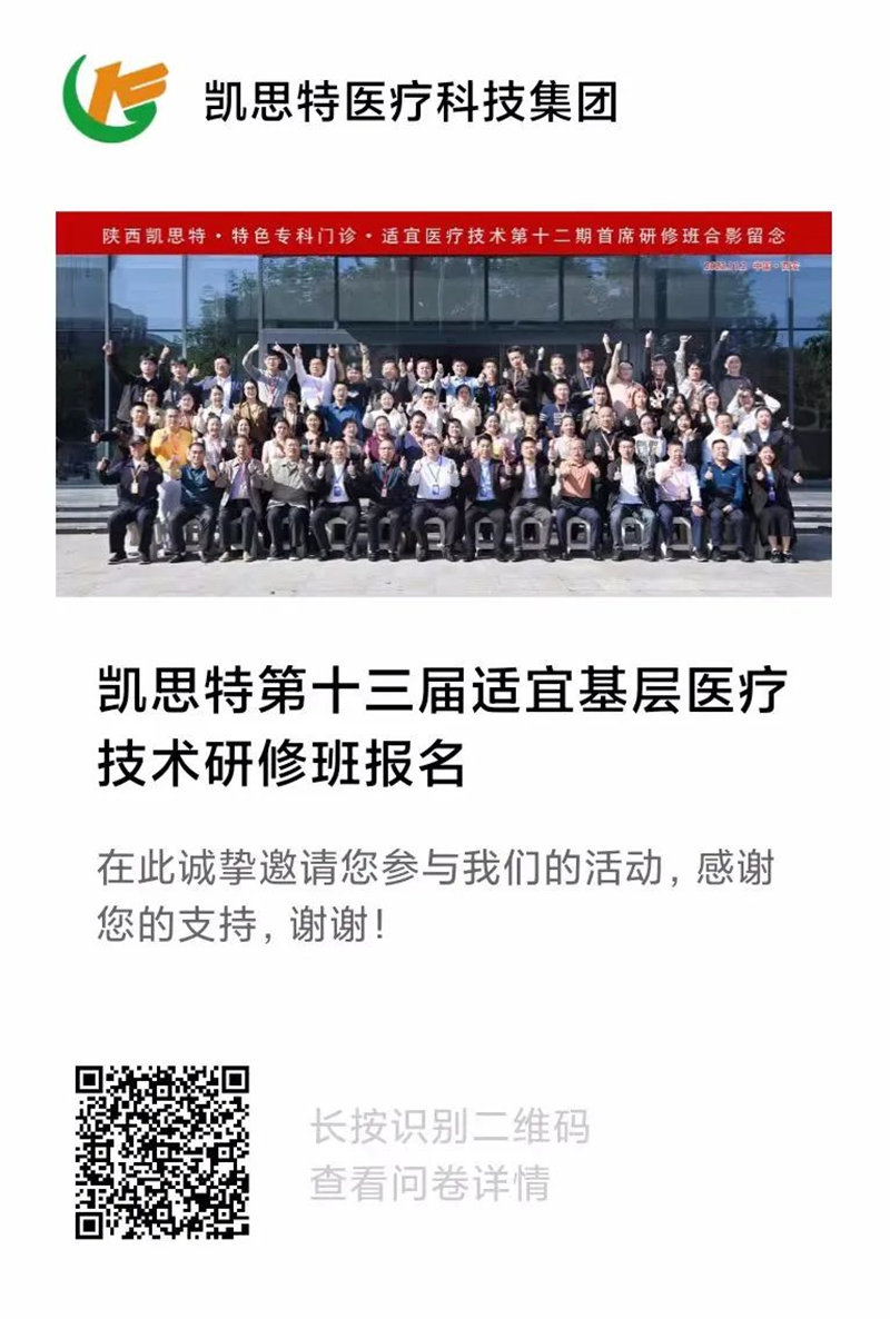 尊敬的醫護同仁們,為了推進基層醫療專業人員的水平提高,進一步加強學術交流與合作,陜西凱思特企業集團即將舉辦第十三屆適宜基層醫療技術研修班。本次研修班定于2024年4月18日至20日在中國咸陽舉辦,本次適宜基層醫療技術研修班旨在為廣大基層醫護人員提供一流的學習交流平臺,深入探討新的適宜技術,共同提高臨床技術水平。歡迎報名參加本次研修班,期待與您相見于中國咸陽。
